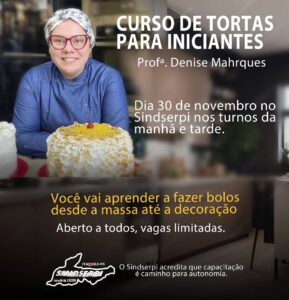 O Sindserpi promoverá o Curso de Tortas para Iniciantes com a professora Denise Mahrques.